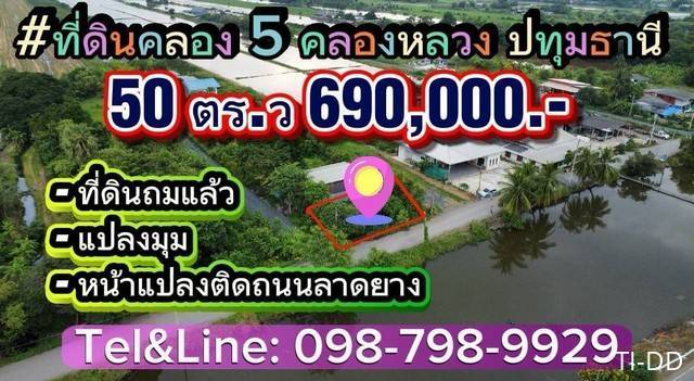 #ที่ดินคลอง 5 คลองหลวงปทุมธานี (ที่ดินถมแล้ว แปลงมุม หน้าแปลงติดถนนลาดยางเลียบคลอง5 ทำเลดีมาก) 50 ตร.ว 690,000.-